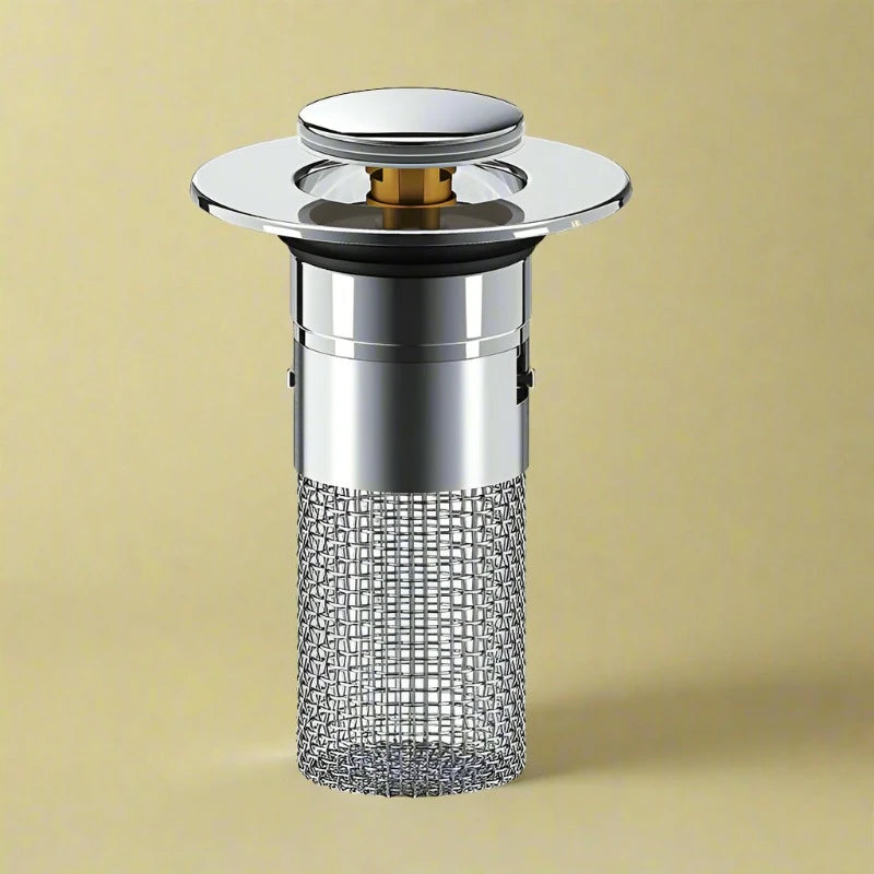 Unlike ordinary push-button drains, this drain stopper features an anti-clogging basket inside that carefully collects hair and prevents the drain from clogging. No jewelry, rings, dirt, or other objects will enter the drainpipe.